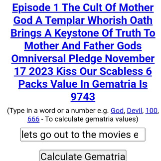 Gematria: LETS GO OUT TO THE MOVIES EPISODE 1 THE CULT OF MOTHER GOD A TEMPLAR WHORISH OATH
